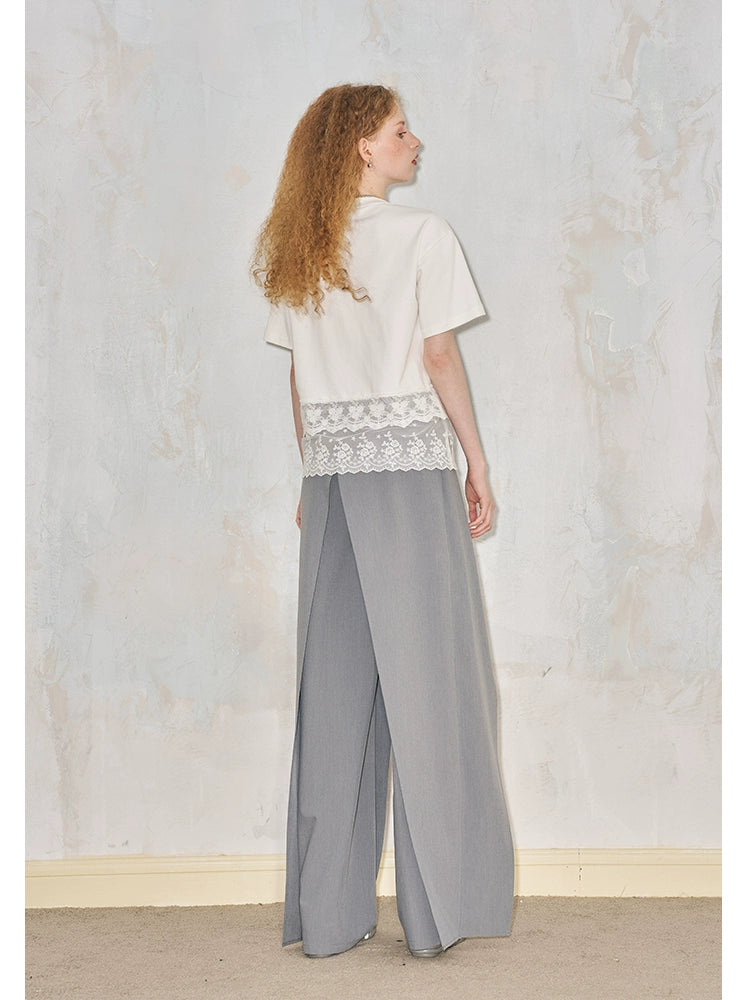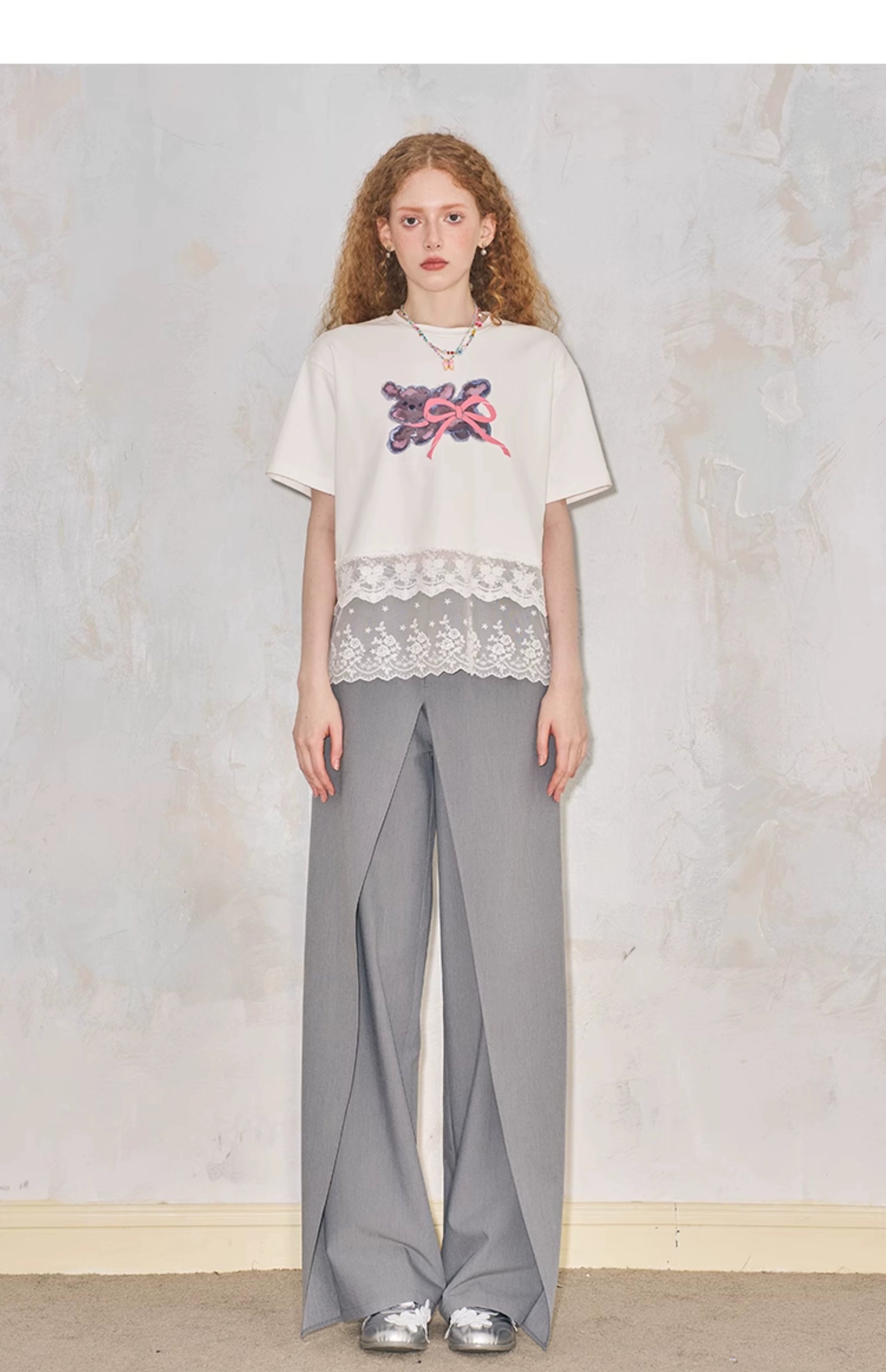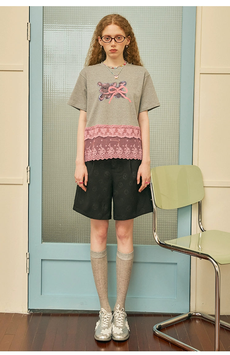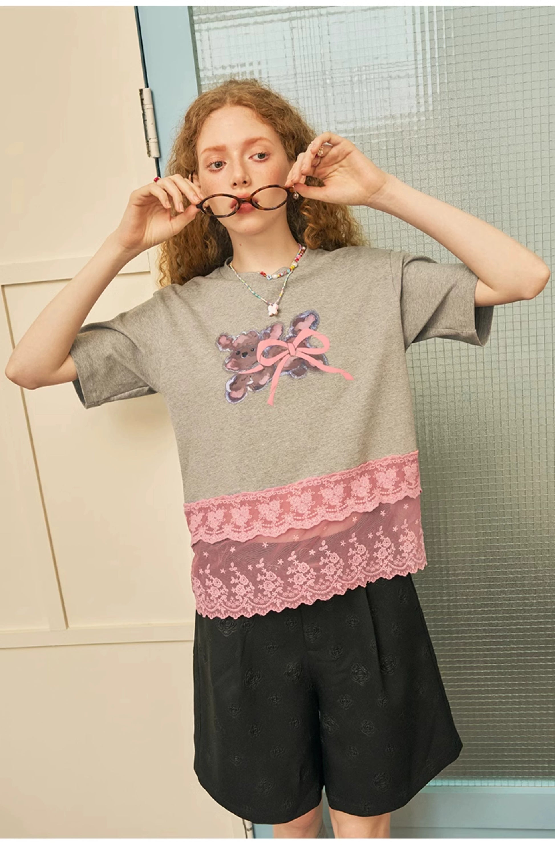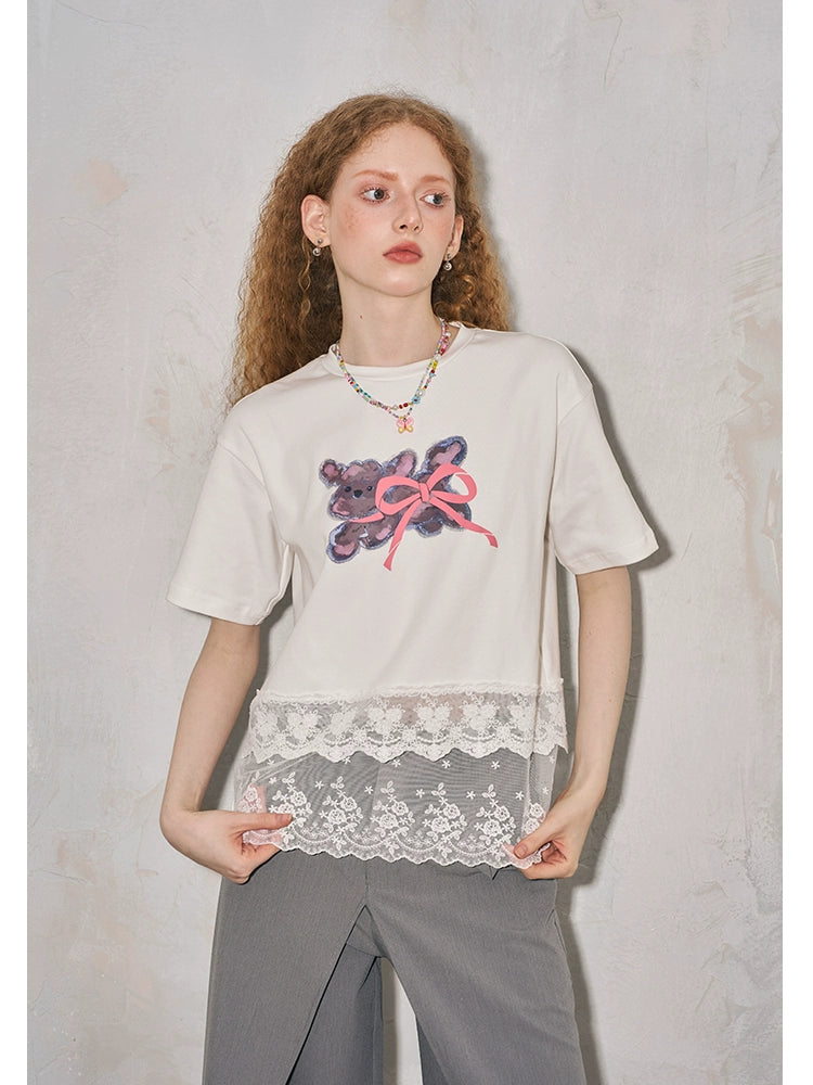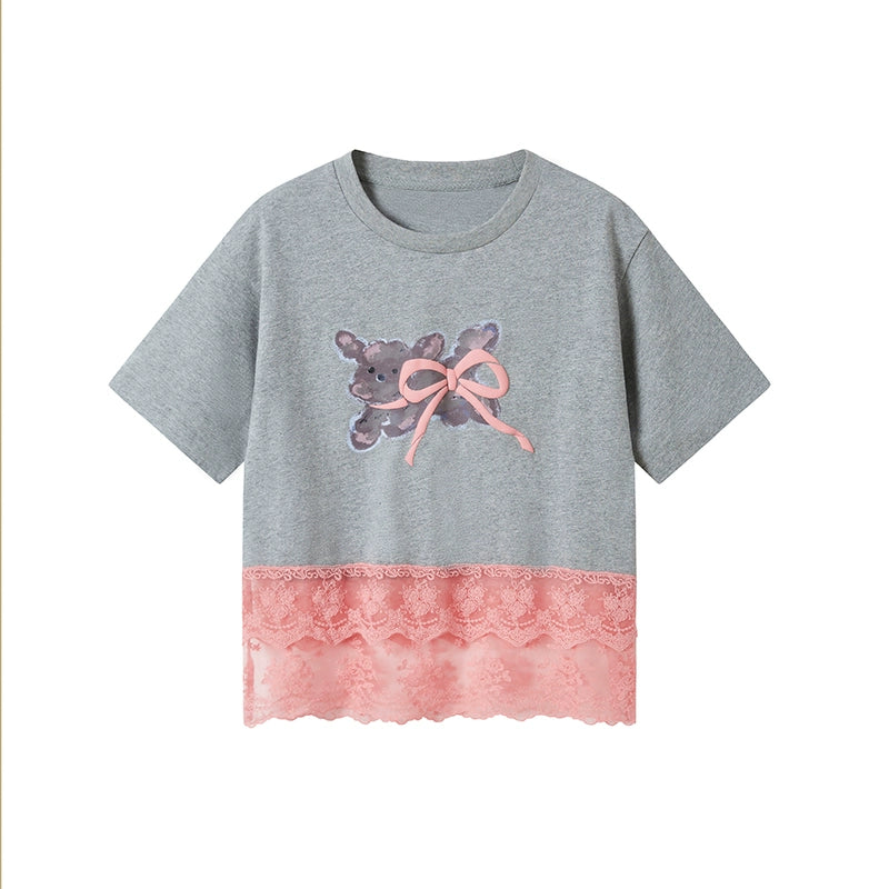 Running Puppy Print Cotton T-Shirt With Lace-Trimmed Hem