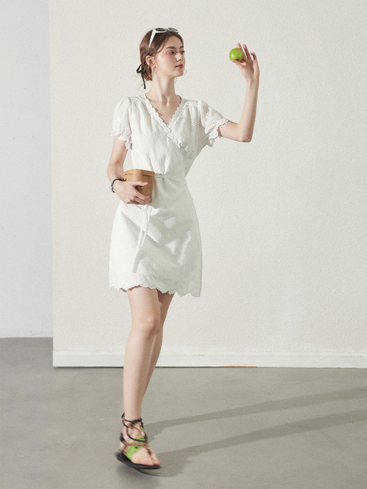Scallop Hem Eyelet Embroidered Wrap Dress