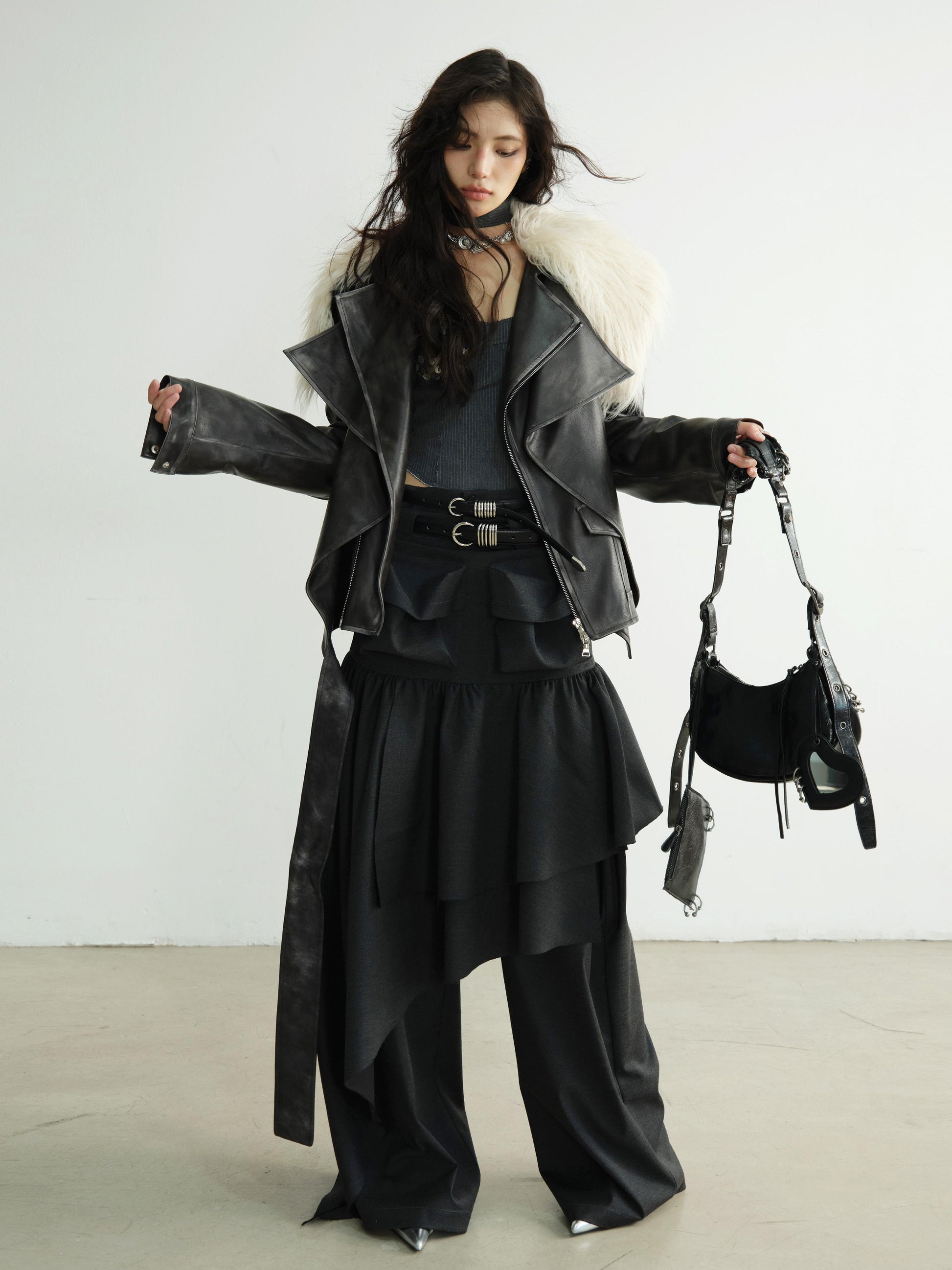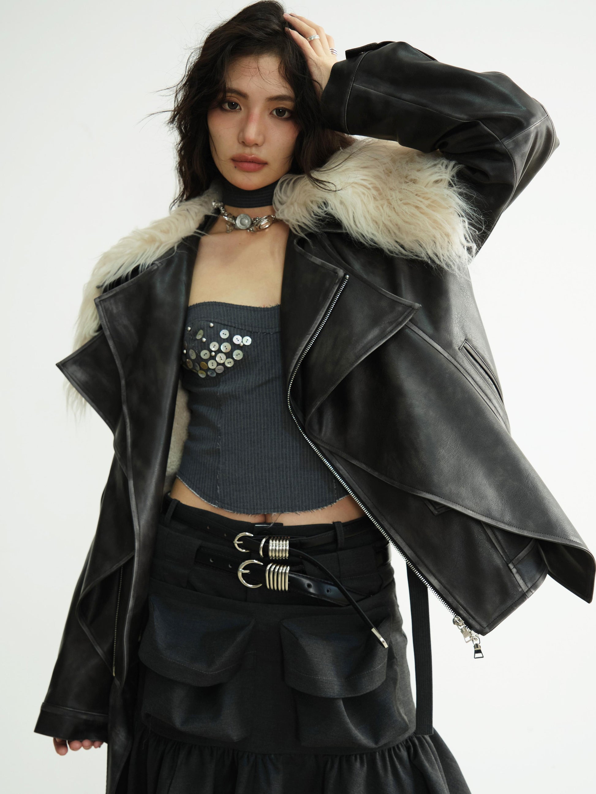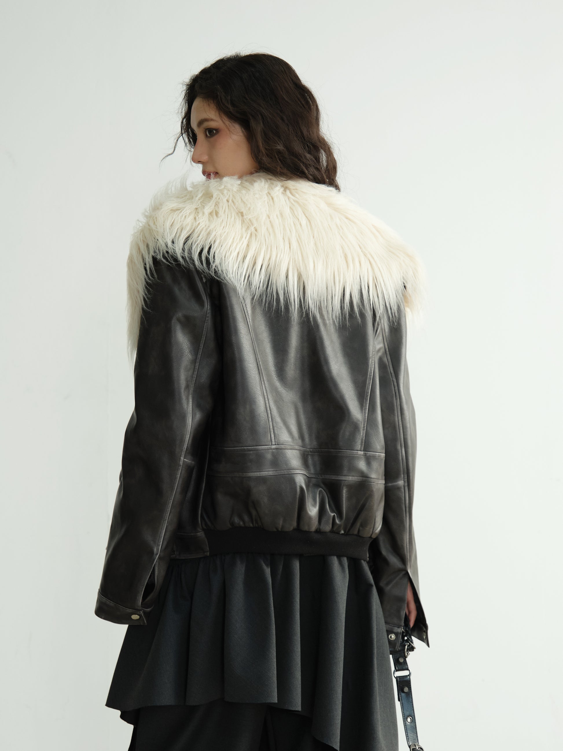 Shaggy Fur Collar Faux Leather Moto Jacket