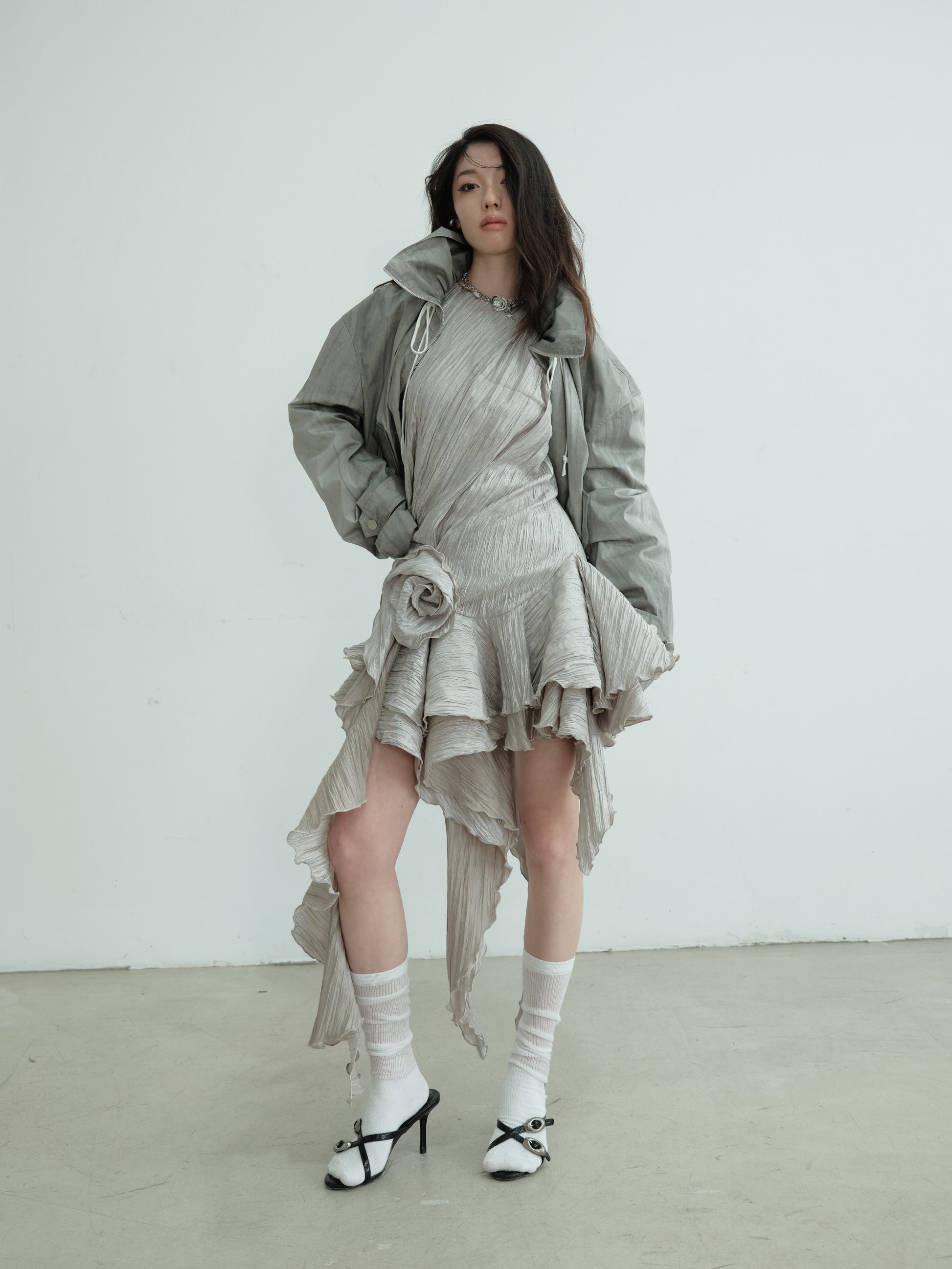 Sleeveless Crinkled Dress With Asymmetric Ruffled Hem