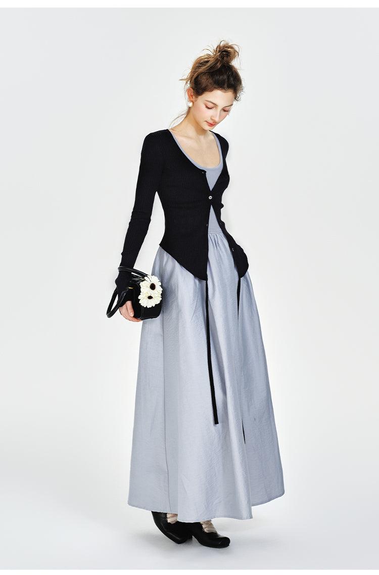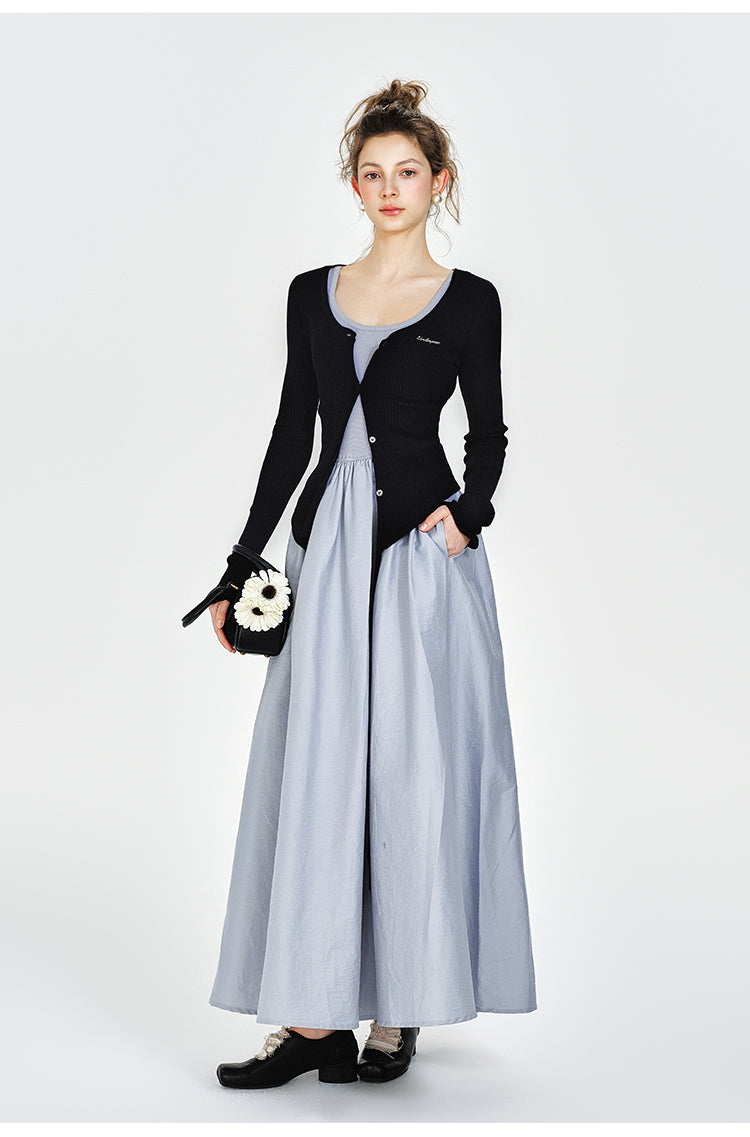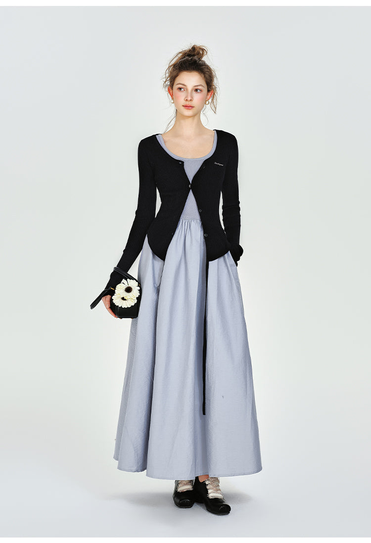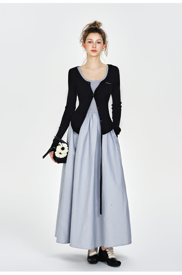 Sleeveless Mixed Fabric Dress, Slim Fit Cardigan