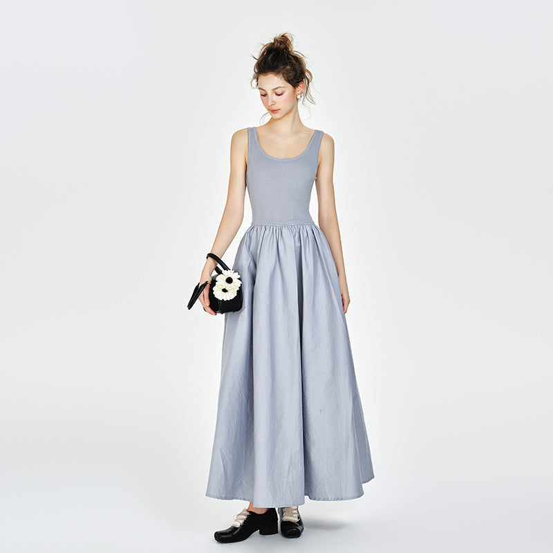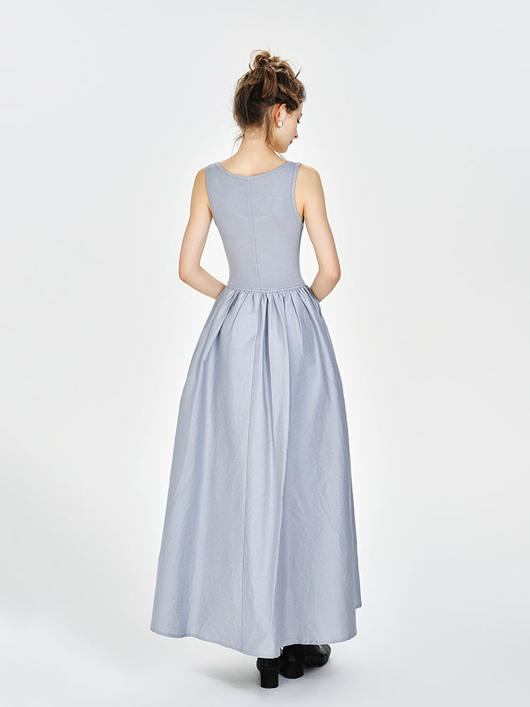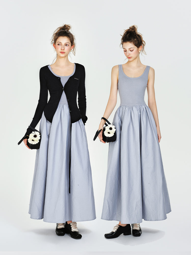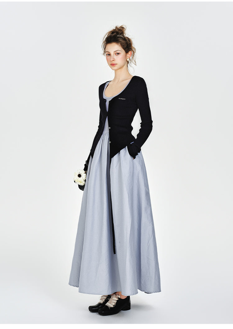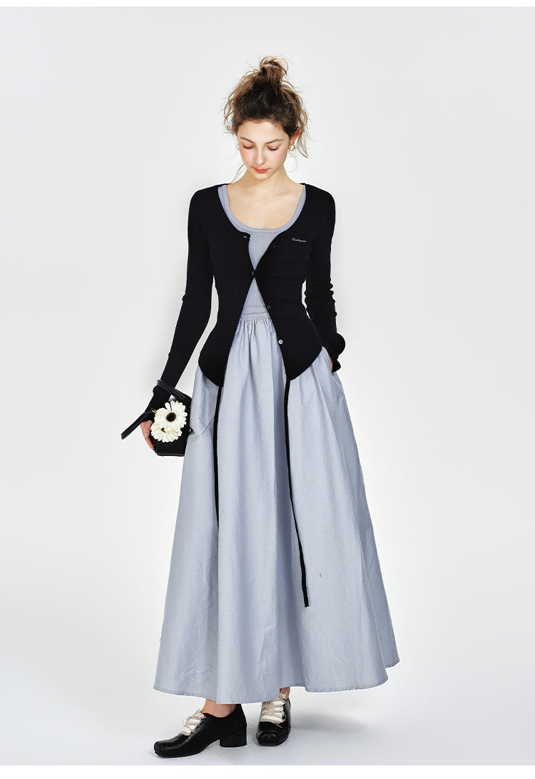 Sleeveless Mixed Fabric Dress, Slim Fit Cardigan