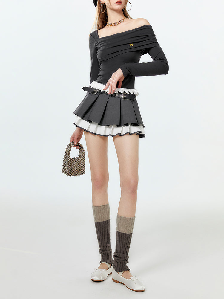 Two-Tone Layered Pleated Low-Rise Micro Mini Skirt