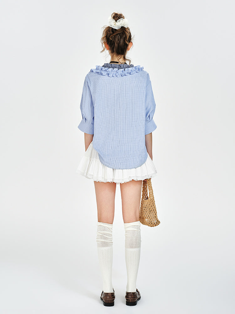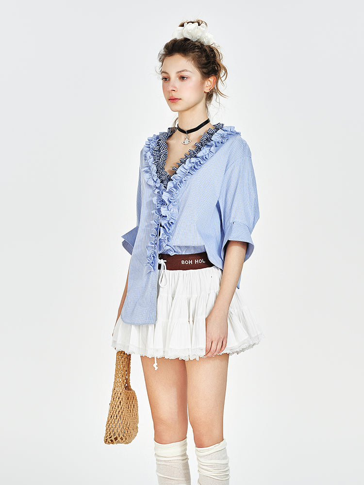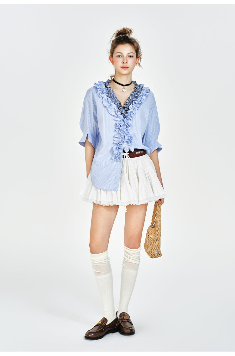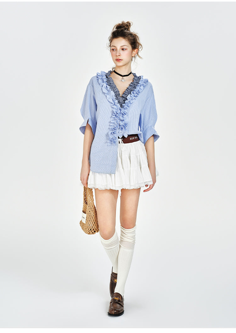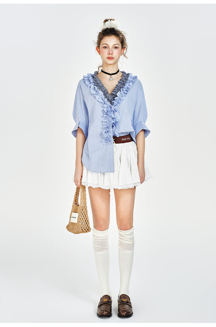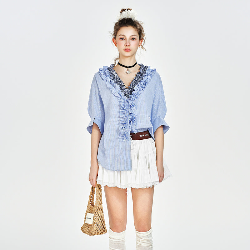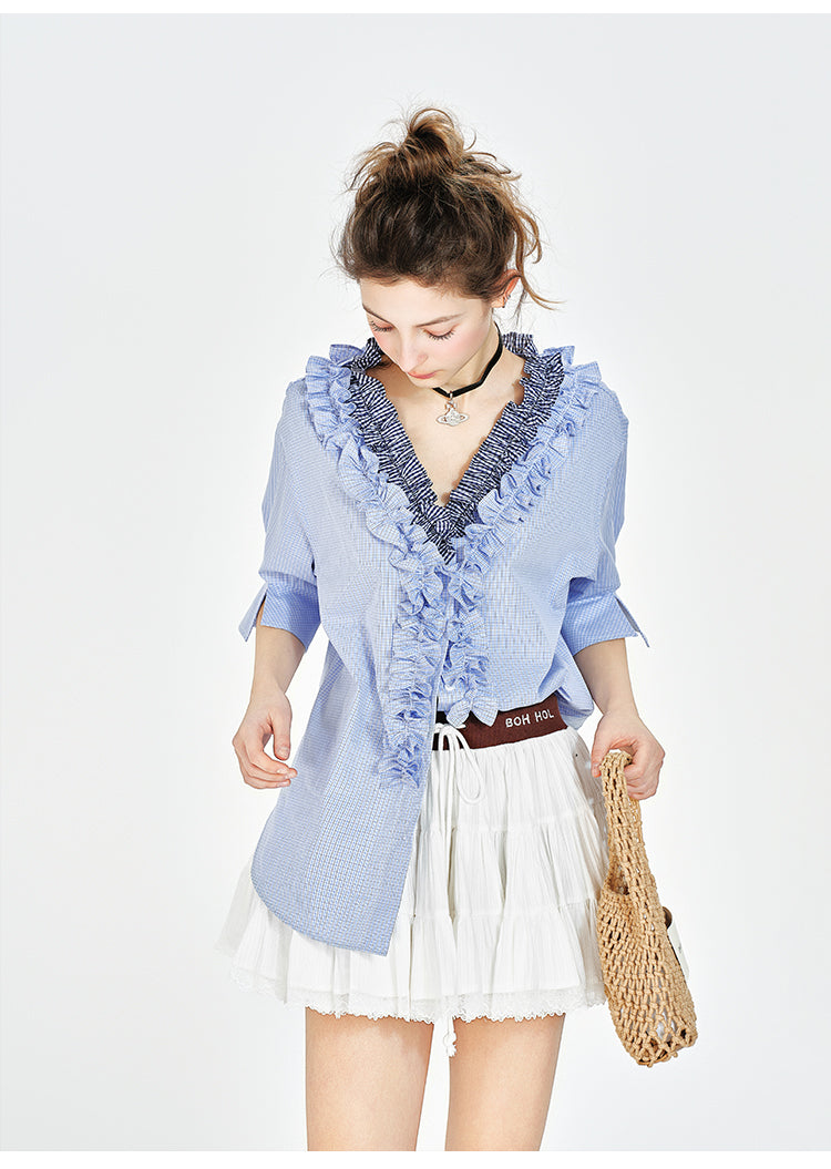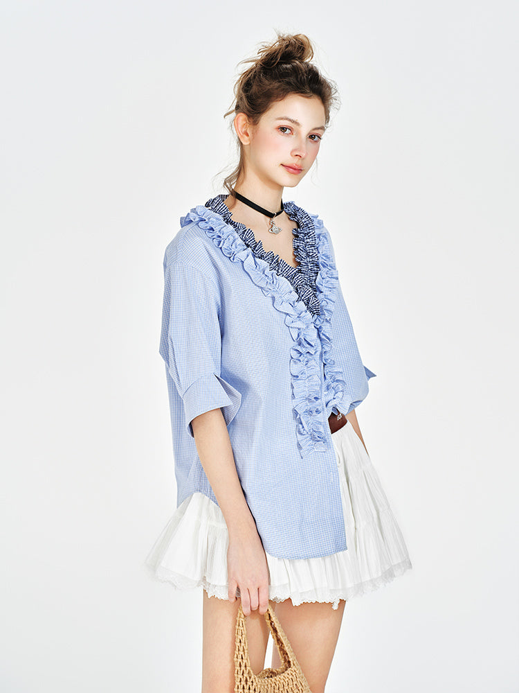V-Neck Ruffled Blouse With Half Sleeves
