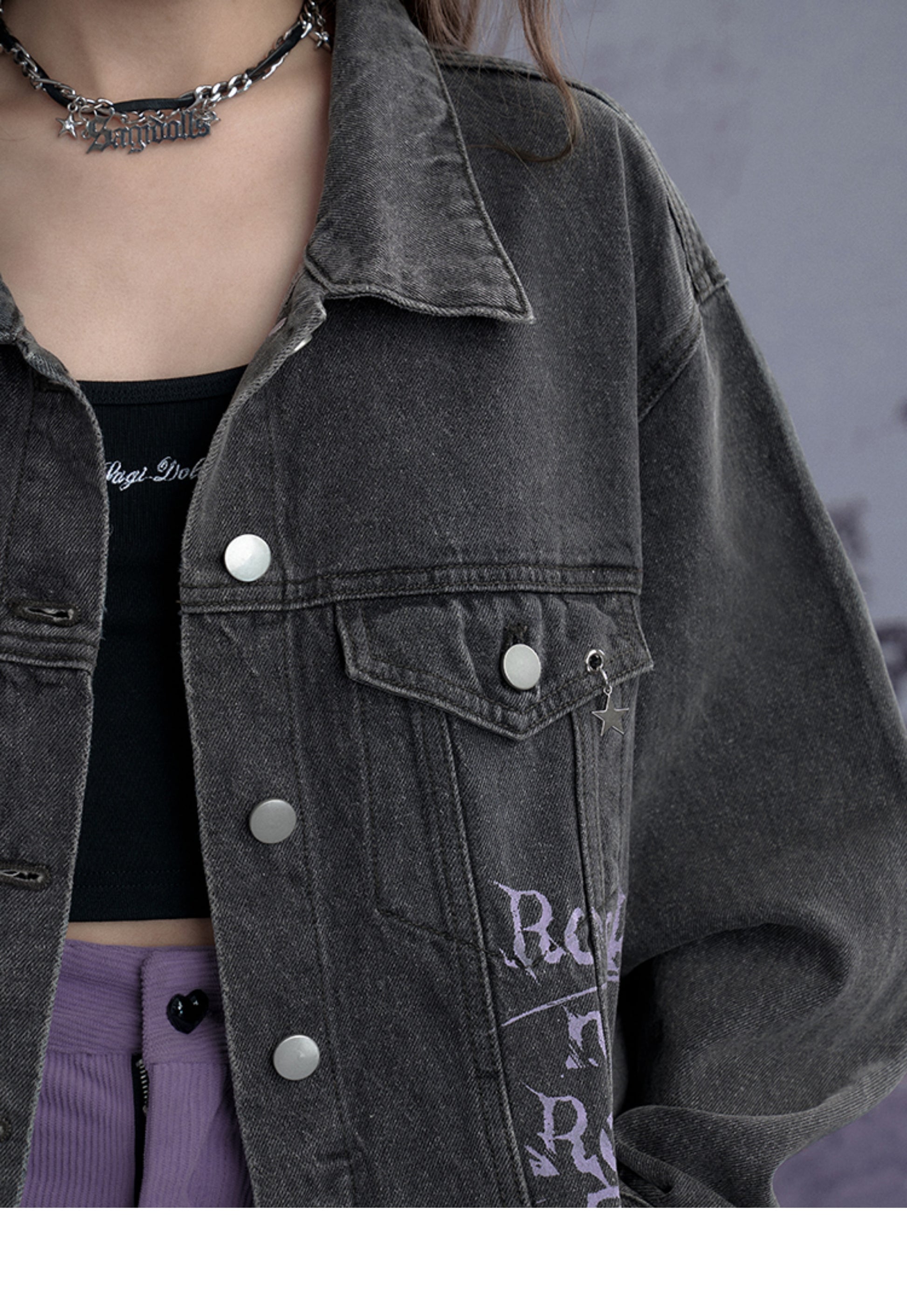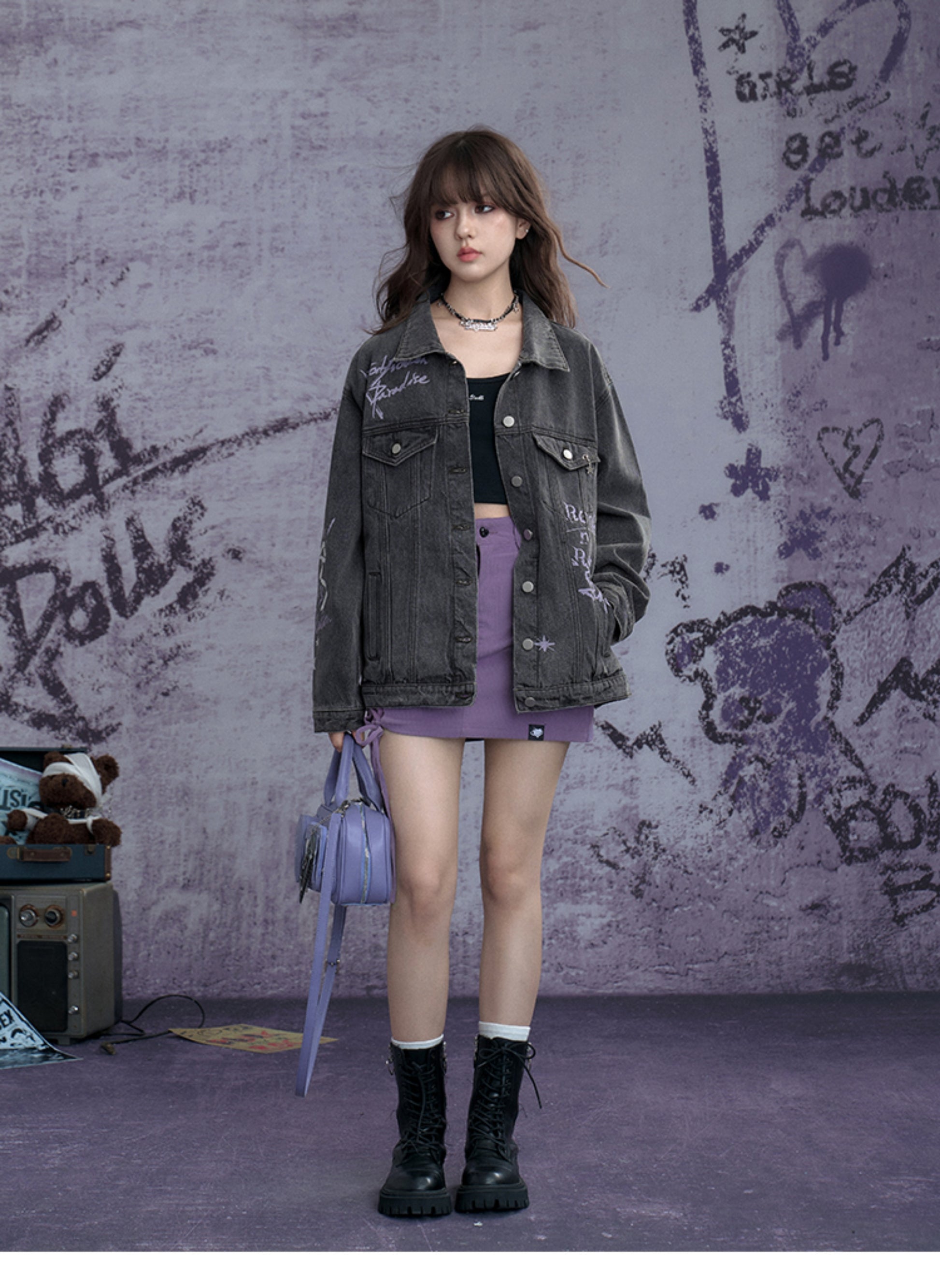 Washed Denim Jacket With Rock Graffiti Print
