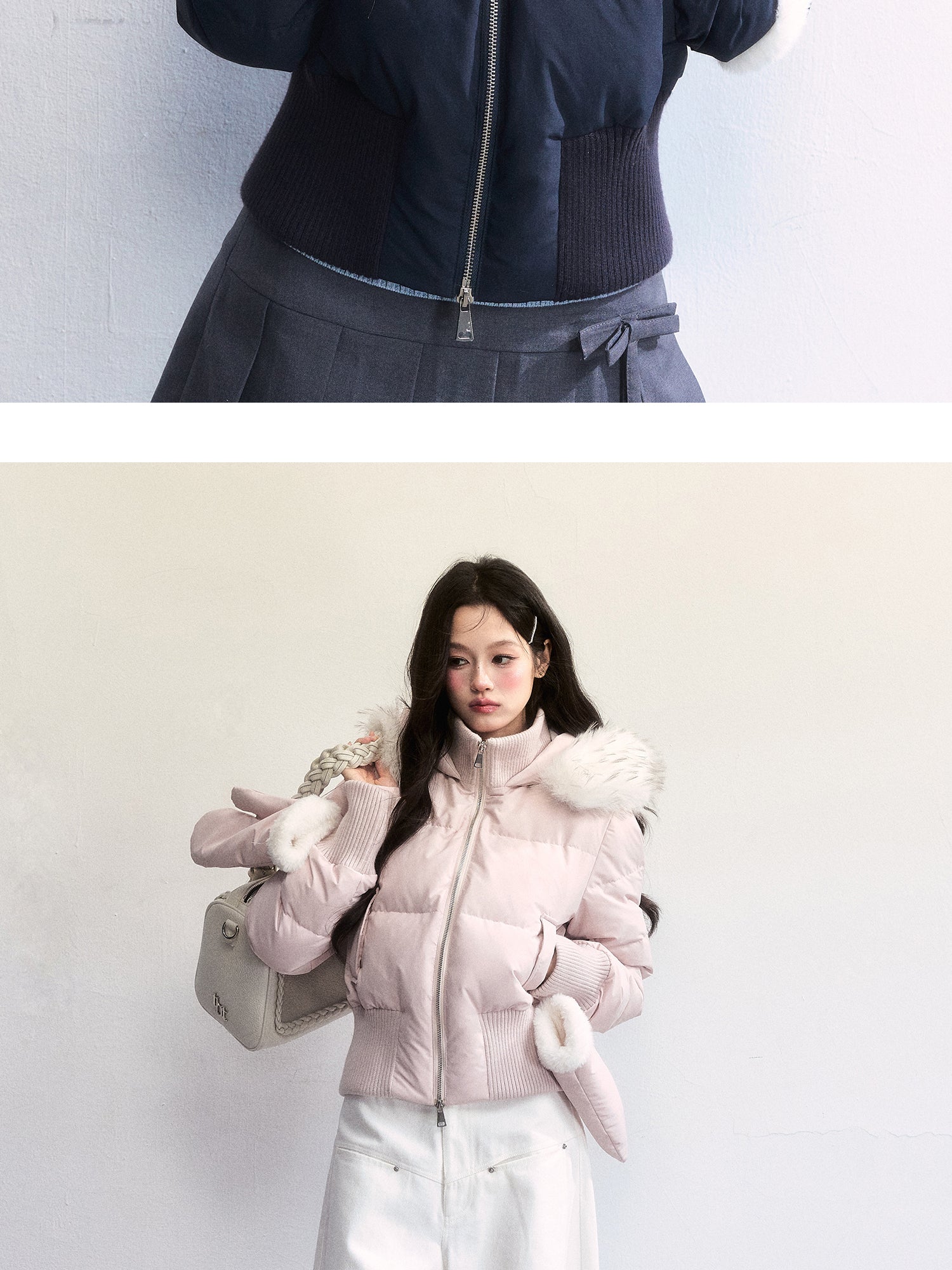 ・Material: 100% polyester fiber / (Lining) 100% polyester fiber / (Filling) 90% white duck down / (Fur collar) faux fox fur / (Knitted fabric) 50% viscose, 22% nylon, 28% polyester fiber